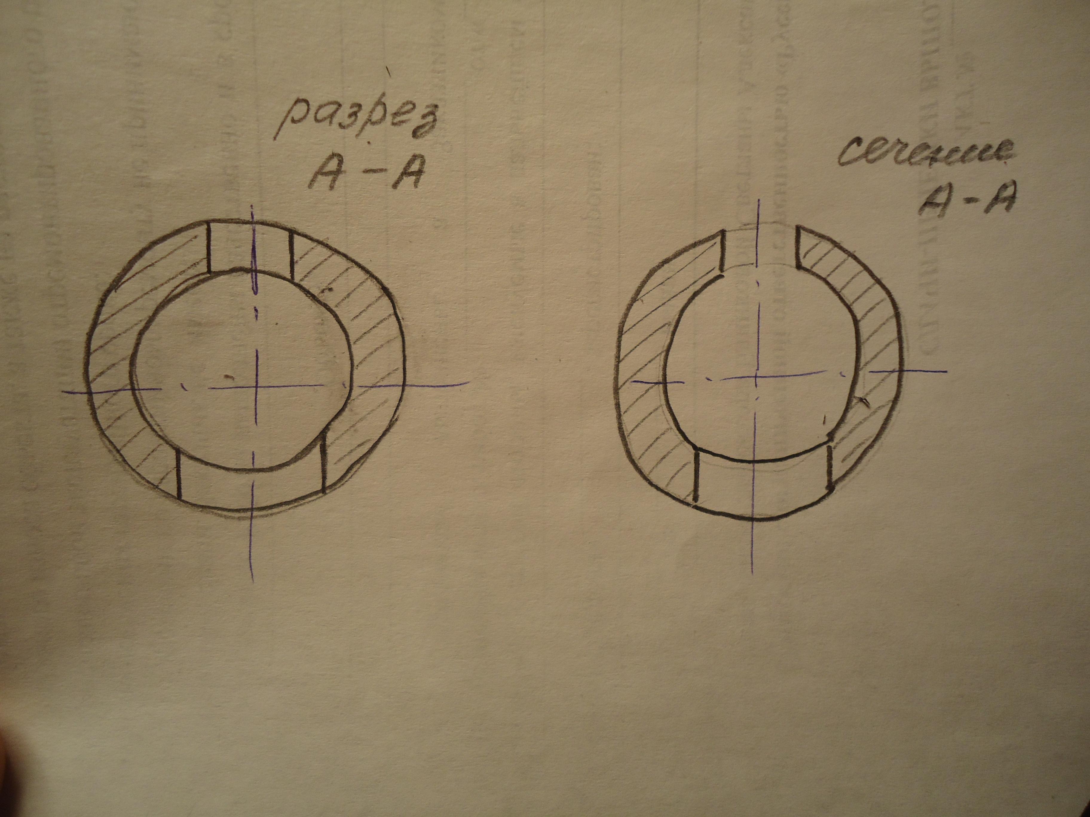 На сечении нижние контуры остаются, т.к. секущая плоскость режет тело вращения (цилиндрическое отверстие).