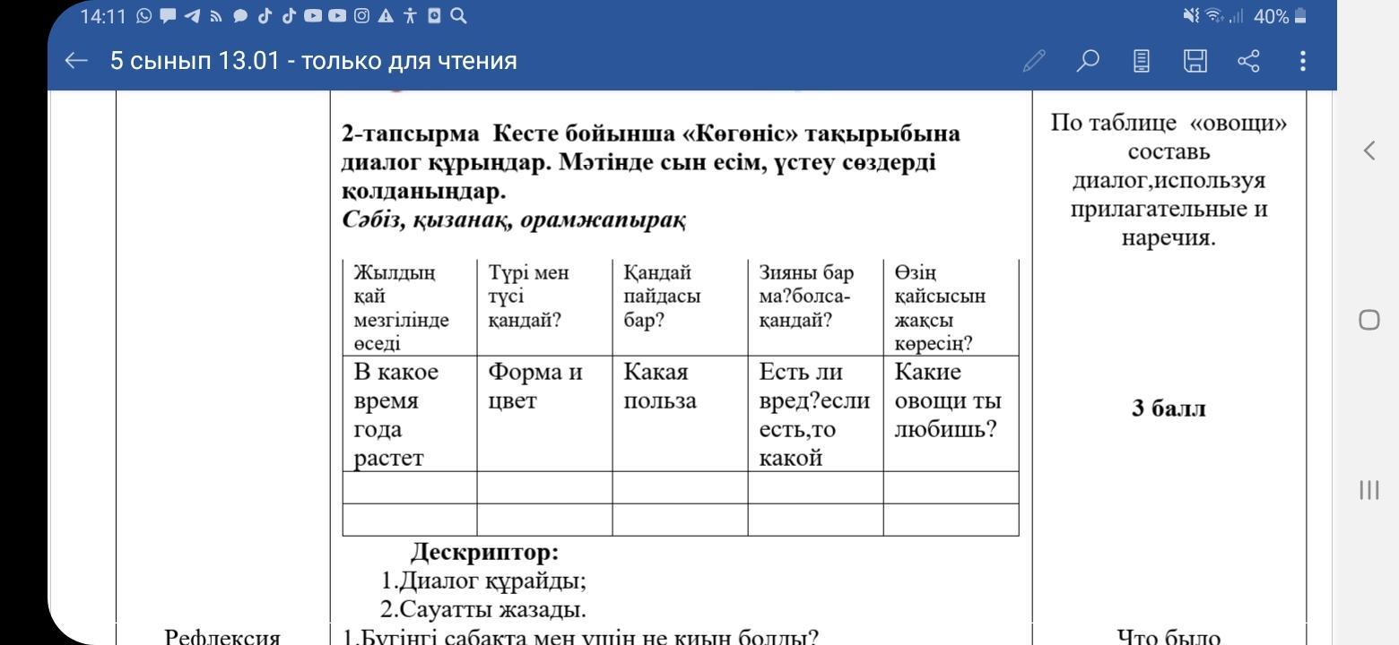 Бұлар күз мезгілінде пісіп жығады.Сәбіздің түсі қызыл-сары және сопақша болып келеді,ал қызанақ қызыл,домалақ болады,орамжапырақ өте көп жапырактардан тұрады.Олар өте пайдалы:оларда витаминдер,бой өсіретін,асқазанның дұрыс жұмыс істеуіне көмектеседі.Мен осылардың ішінен қызанақты жақсы көремін