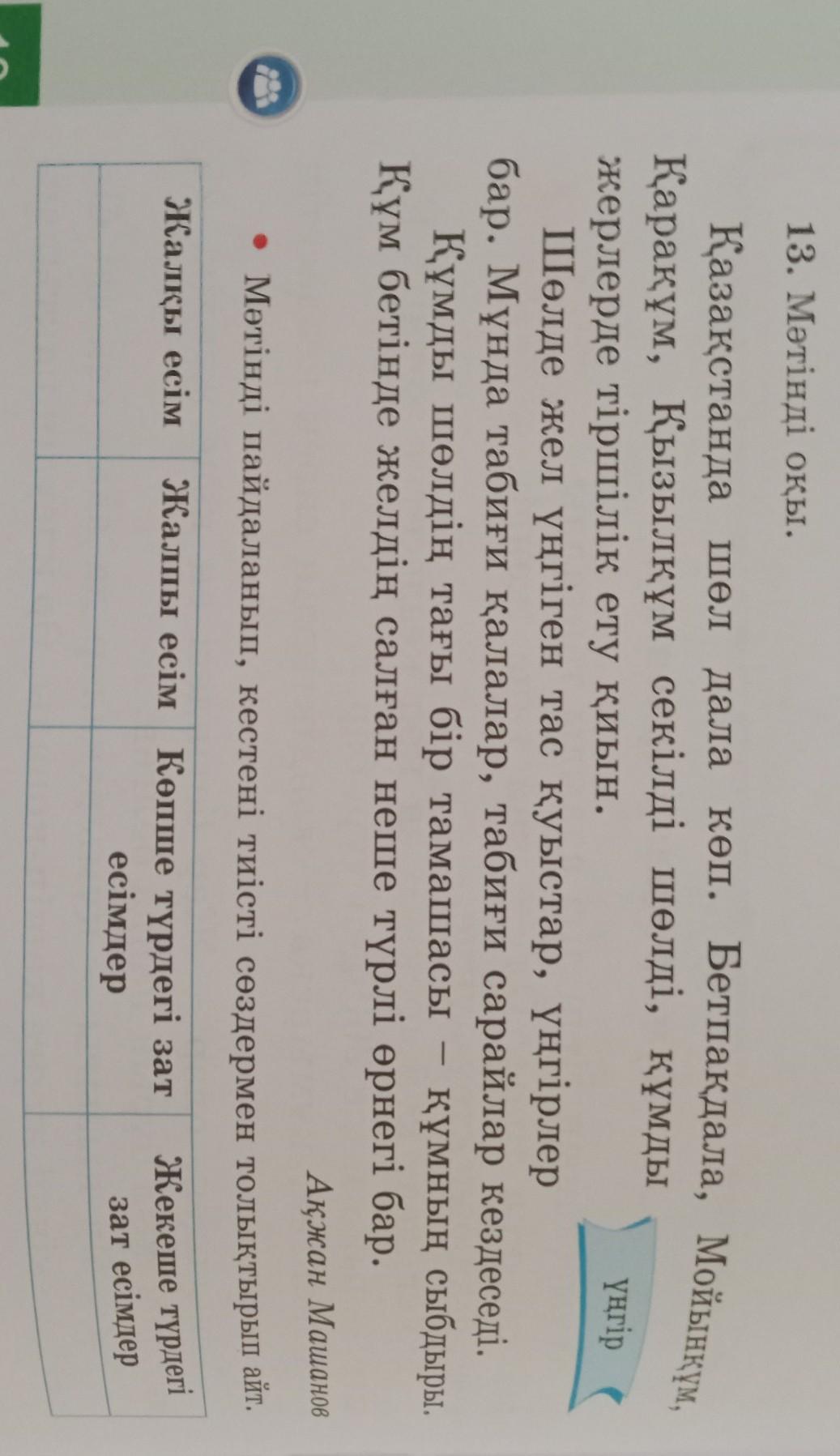 • Мәтінді пайдаланып, кестені тиісті сөздермен толықтырып