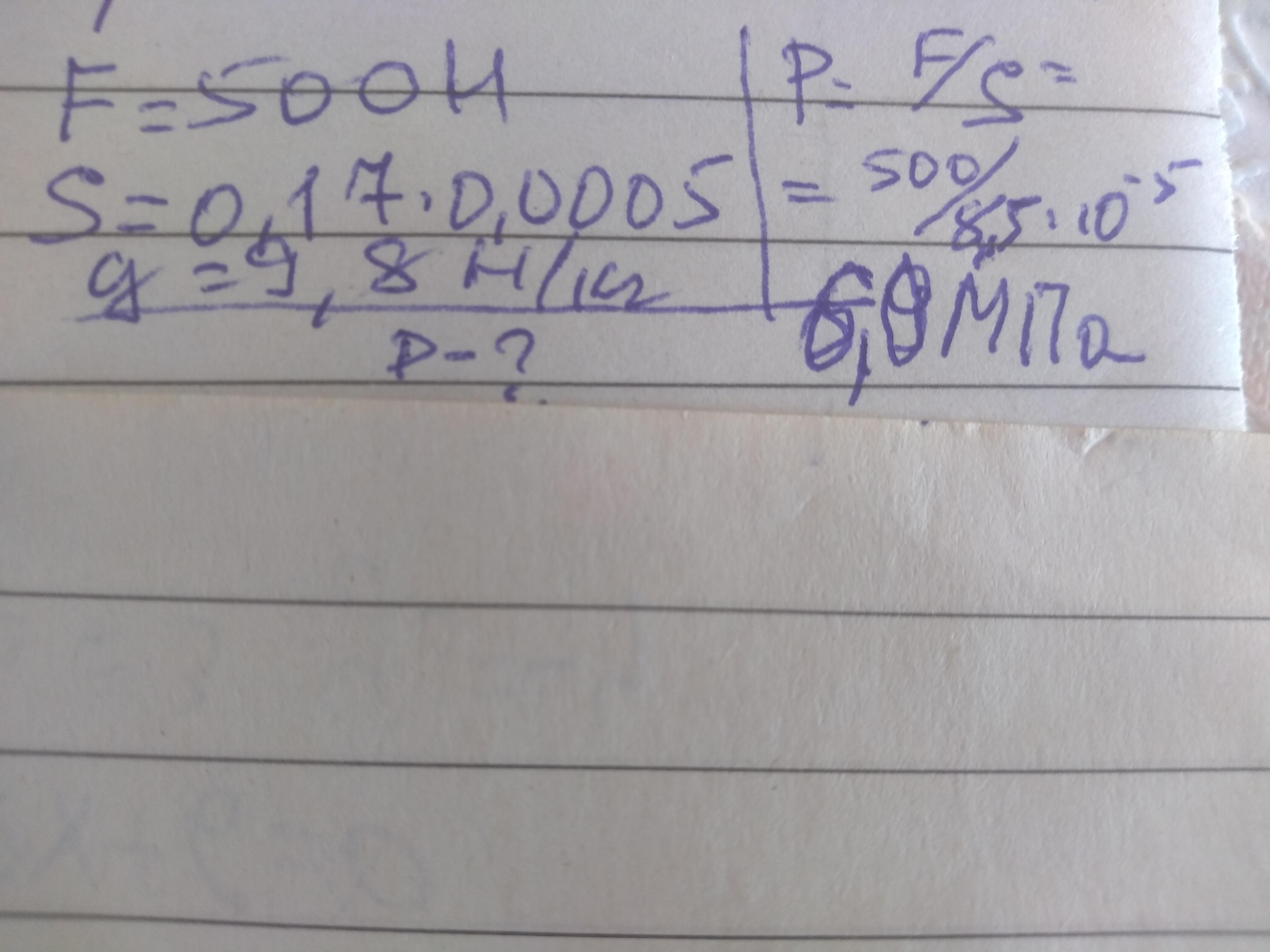Определи, какое давление оказывает лопата на почву, если ширина её лезвия равна 17 см, а толщина режущего края — 0,5 мм. Принять g=9,8Н/кг.