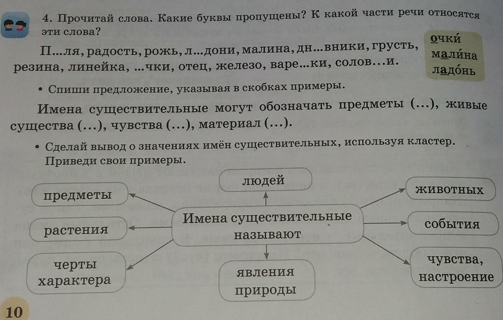 • Сделай вывод о значениях имёи существительных, используя кластер.
