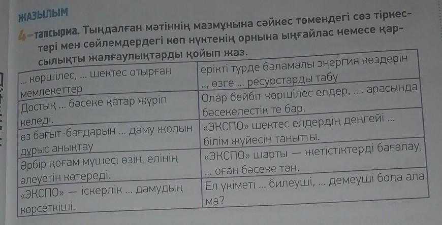 4-тапсырма. Тыңдалған мәтіннің мазмұнына сәйкес төмендегі сөз тіркес-