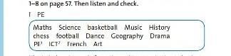 Maths - математика, Science - наука, basketball - баскетбол, Music - музыка, History - история, chess - шахматы, football - футбол, Geography - география, Drama - драма, PE' -физкультура, ICT - информационно-коммуникационные технологии, French - французский язык, Art - рисование.