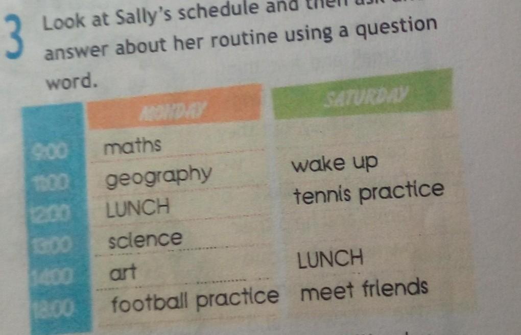Look at Sally's schedule and then askn and answer about her routine using a question word