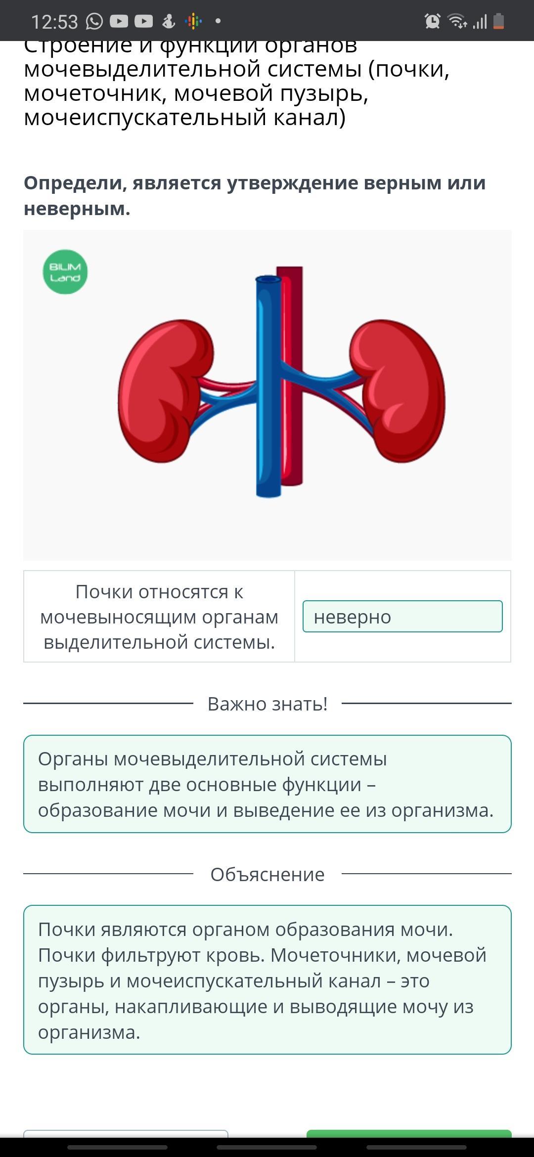 Определи является утверждение верны или неверны почки относятся к мочи выносящий органам выделительной системы