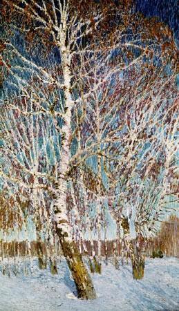 Береза - на переднем плане. Жемчужный ствол ее завершается шапкой, состоящей из осенней листвы коричневого цвета. Ее подружки - совсем рядом. На заднем плане внимательный зритель видит низкий кустарник, который тоже помнит прошлогодний октябрь.