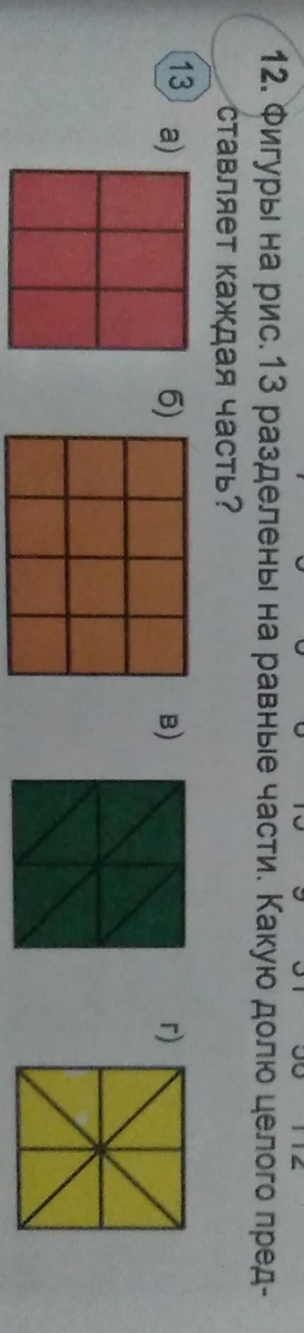 Фигуры на рис.13 разделены на равные части.Какую долю целого представляет каждая часть?