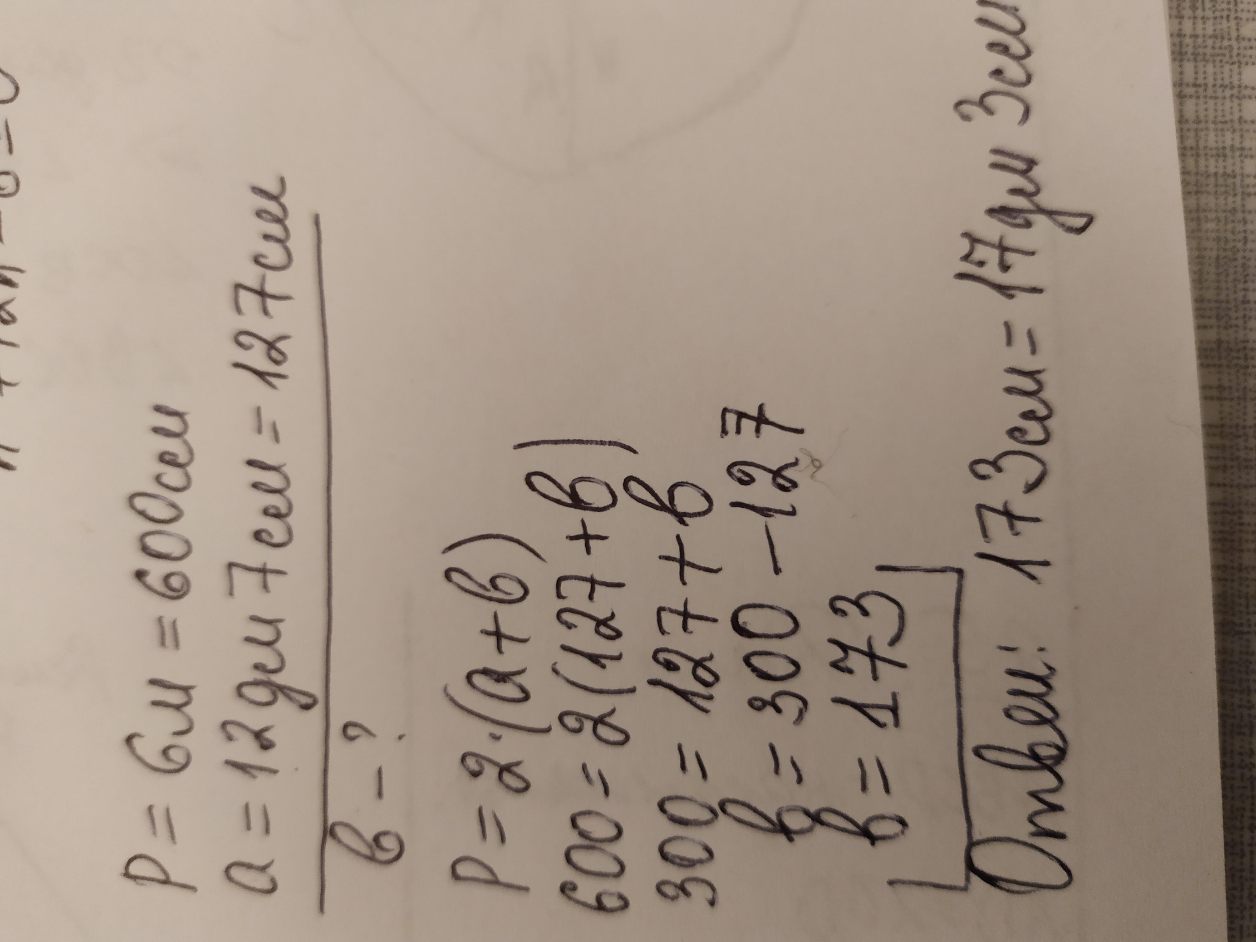 Р=6м=600см ширина= 12дм 7см=127см Р=2 (ширина+длина) 600=2(127+х) 600=254+2х 600-254=2х 346=2х х=173 см ответ: длина = 173см= 17дм 3см.