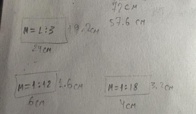 На чертеже в масштабе 1:3 длина прямоугольника равна 24см,а ширина 19,2 см. Чему равна длина и ширина этого прямоугольника в масштабе 1:12? А в масштабе 1:18? Помогите пожалуйста