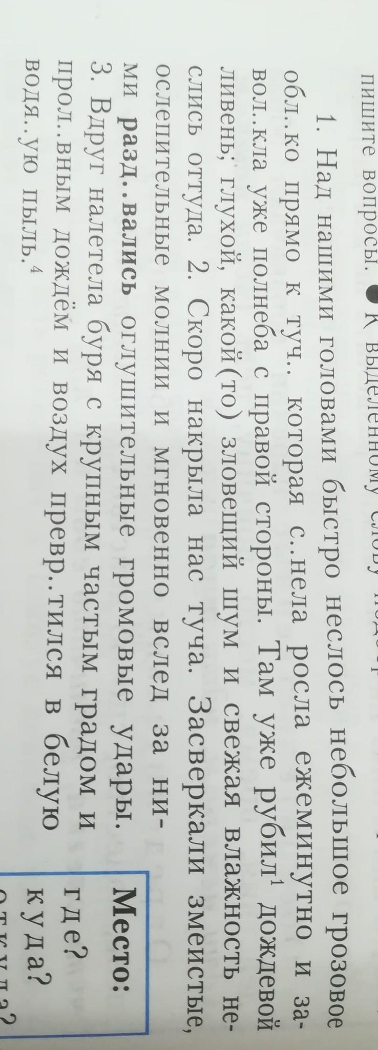 1. Над нашими головами быстро неслась небольшое грозовое облако прямо к туче, которая синела, росла ежеминутно и заволокла уже полнеба с правой стороны. Там уже рубил дождевой ливень; глухой, какой-то зловещий шум и свежая влажность неслись оттуда. 2. Скоро накрыла нас туча. Засверкали змеистые, ослепительные молнии и мгновенно вслед за ними раздавались оглушительные, громовые удары. 3. Вдруг налетела буря с крупным, частым крадом и проливным дождем, и воздух превратился в белую, водяную пыль.