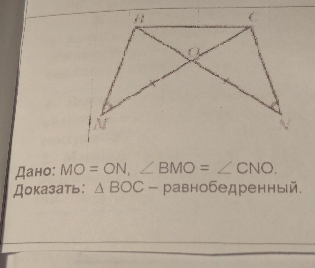 Рассмотрим треугольники BOM и CON, у них MO=ON, угол BMO=CNO и угол BOM=CON, т.к они вертикальные углы. Значит треугольники BOM и CON равные, а в равных треугольниках против равных углов лежат равные стороны, значит ВО=ОС. Рассмотрим треугольник ВОС, у него ВО=ОС, значит он равнобедренный, т.к равнобедренный треугольник, это треугольник у которого 2 стороны равны.