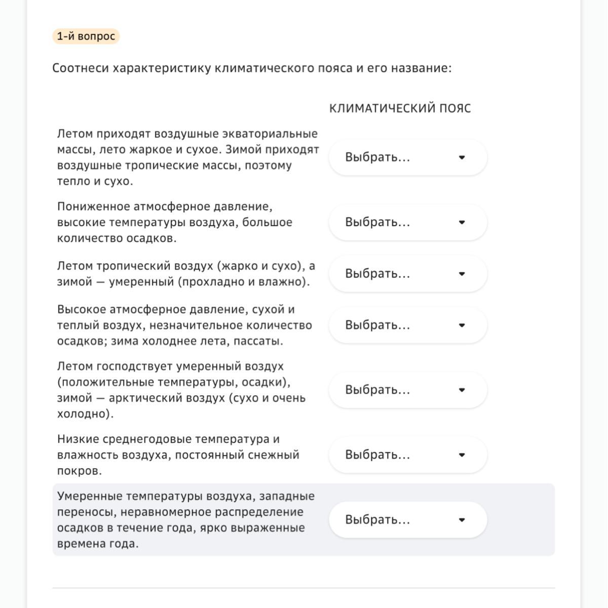 Климатические пояса: арктический, субарктический, субтропический, субэкваториальный, тропический, умеренный, экваториальный