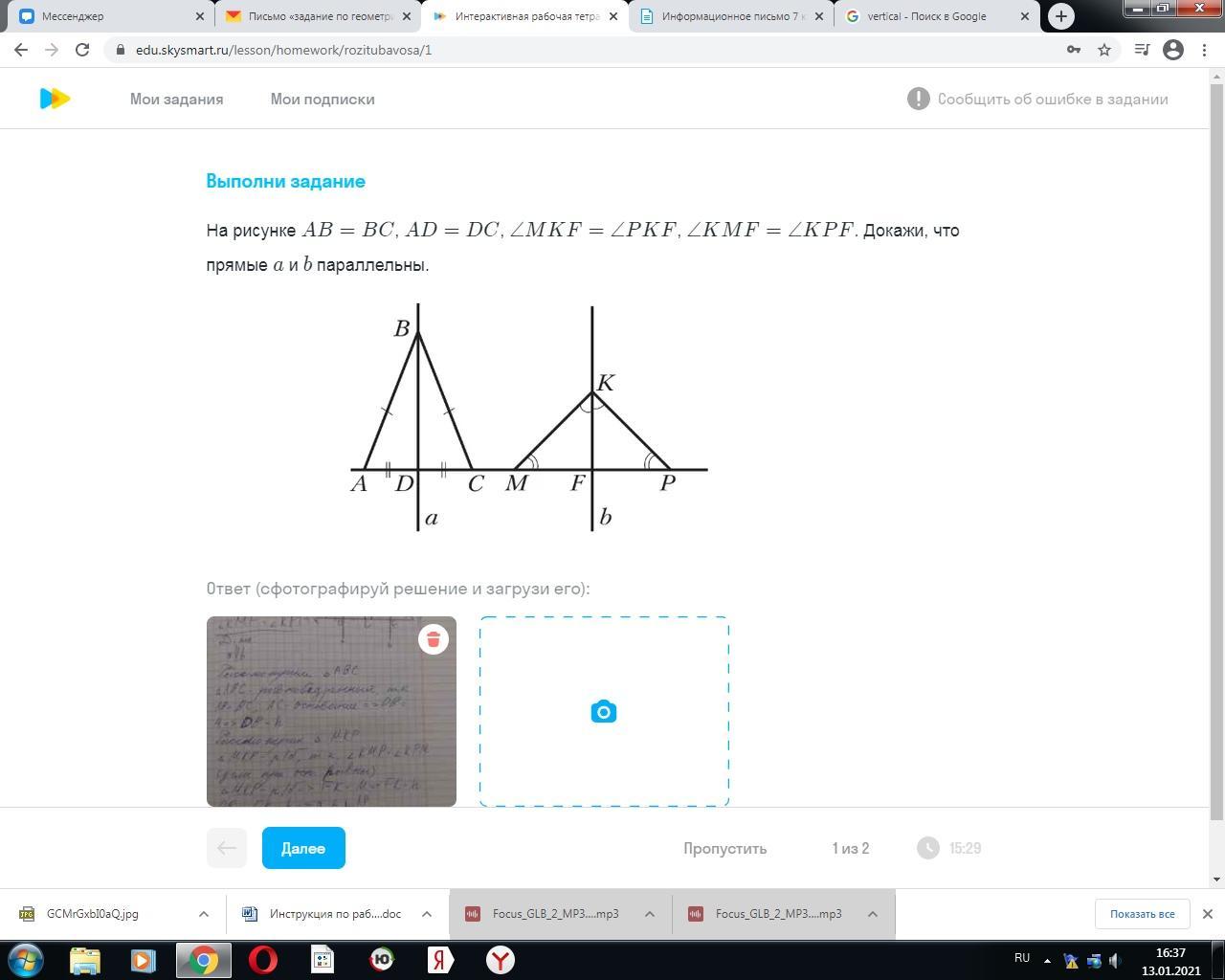 В р/б треугольнике медиана/бисса, проведённая к основанию является высотой—> каждый из углов прямой—> прямые параллельны по односторонним/соответственным углам