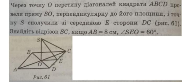 Рассмотрим △SOE. В нём OE=AB/2=8/2=4 (Точка пересечения диагоналей называется центром квадрата и также является центром вписанной и описанной окружности). tgSEO=tg60=SO/OE=√3. SO=OE*√3=4√3.