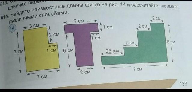 Найдите неизвестные длины фигур на рисунке 14 и Рассчитайте периметр различными способами