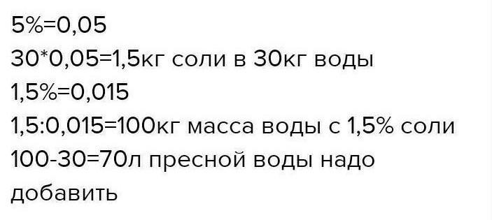 долити до 30 кг морської води, щоб концентрація солі була 1,5%?