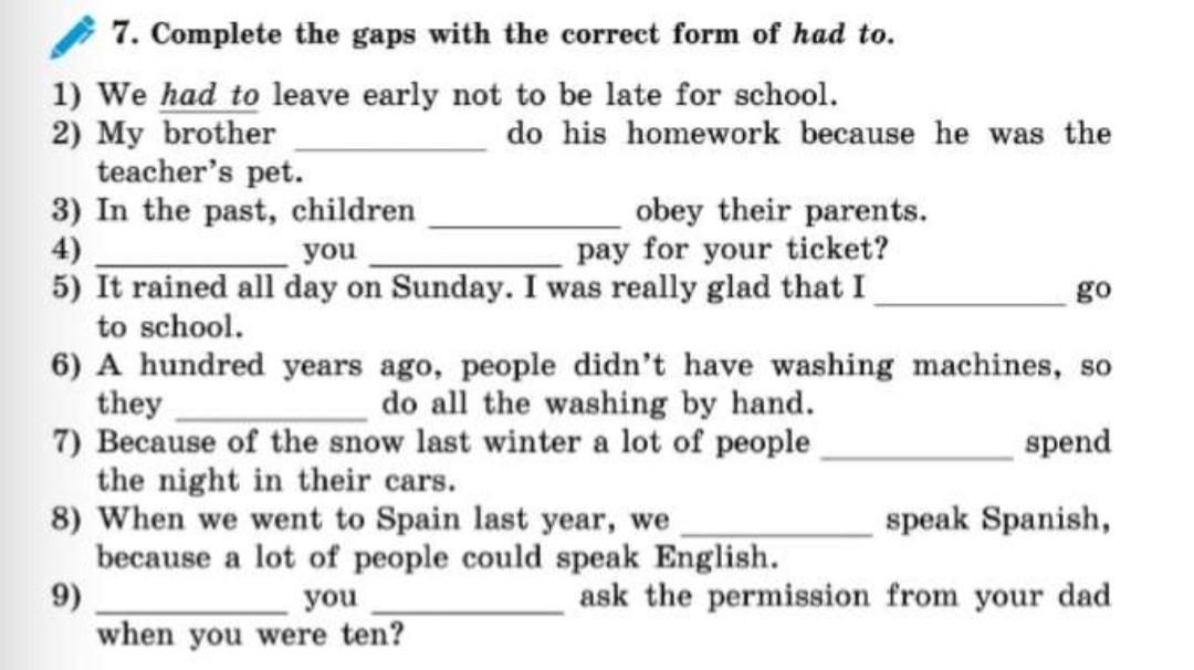 8) When we went to Spain last year, we didn't have to speak Spanish, because a lot of people could speak English.
