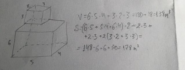 Ответ: 138 куб.единиц; 178 кв.единиц.