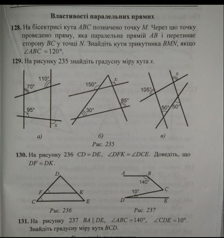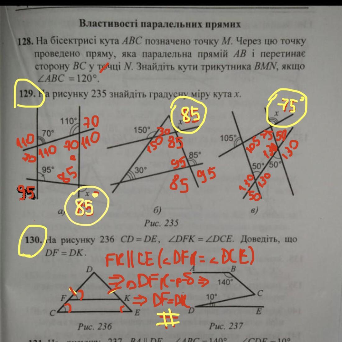 129а)Т.к 70+110=180, то прямые параллельны( по свойству односторонних углов). Тогда вертикальный угол для х будет тоже х. По свойству односторонних углов х+95=180 или х=180-95=85
