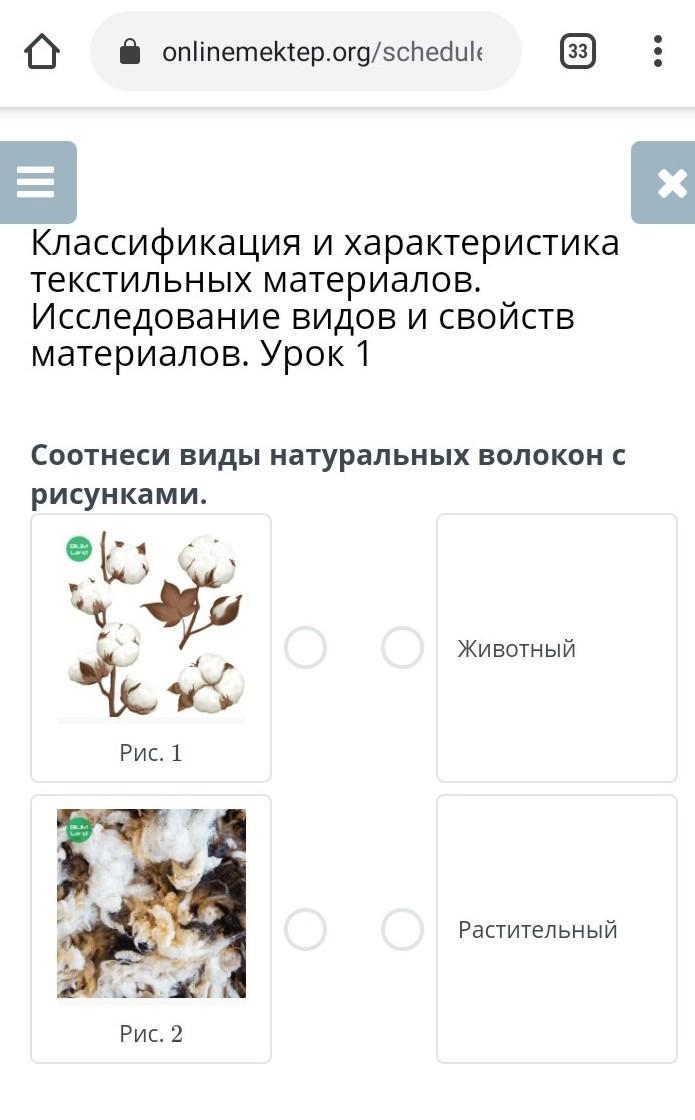Классификация и характеристика текстильных материалов. исследование видов и свойств материалов. урок 1 соотнеси виды натуральных волокон с рисунками. животный рис. 1 растительный рис. 2
