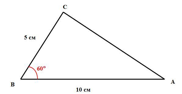 Дан треугольник ABC. Если AB = 10 см, BC = 5 см и ∠B =60°, то найди длину стороны AC.