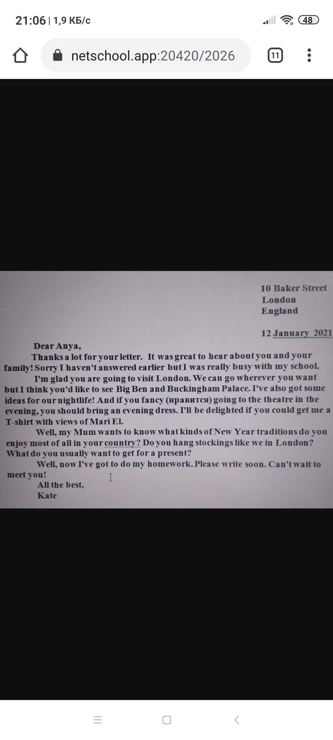 Hello my dear friend. How are you doing? I see you are living interestingly. And I recently went to my grandmother, nothing unusual. I have to answer all your questions in the negative, I'm sorry, but I'm not particularly involved in this. How is your mom? What did you get for the new year, and what did you want? I hope that homework was good. Bye, write to me soon!
