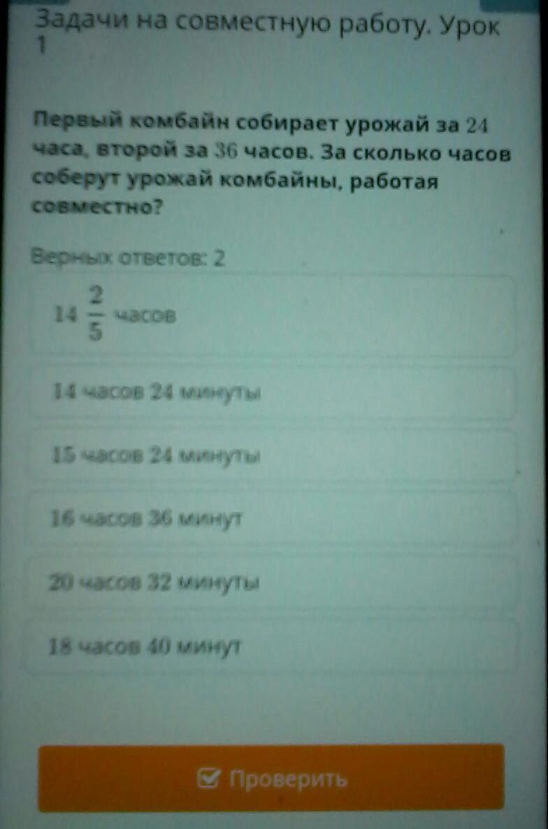 первый комбайн собирает урожай за 24 часа второй за 36 часов Сколько часов собирают урожай комбайна работая совместно верных ответов 2