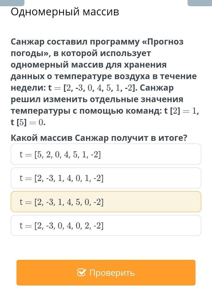 Санжар составил программу «Прогноз погоды», в которой использует одномерный массив для хранения данных о температуре воздуха недели: t 3 [2, -3, 0, 4, 5, 1, -2]. Санжар решил изменить отдельные значения температуры с помощью команд: t [2] — 1, t [5] 0
