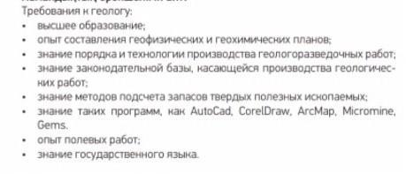 знание таких программ, как AutoCad, CorelDraw, ArcMap, Micromine,