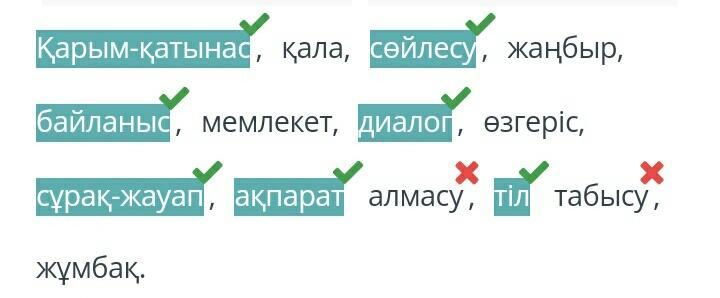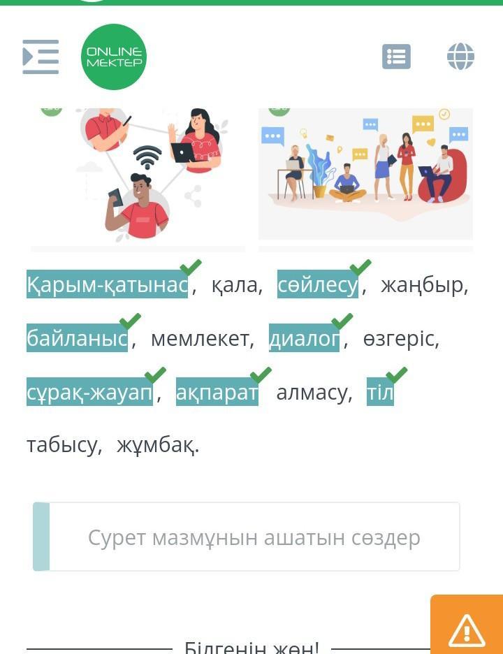 Суреттердің мазмұнын ашатын сөздерді белгіле . Қарым - қатынас , қала , сөйлесу , жаңбыр , байланыс , мемлекет , диалог , өзгеріс , сұрақ - жауап , ақпарат алмасу , тіл табысу , жұмбақ . Сурет мазмұнын ашатын сөздер