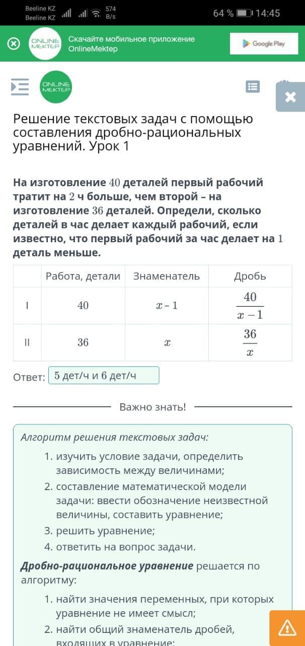 На изготовление 40 деталей первый рабочий тратит на 2 ч больше, чем второй – на изготовление 36 деталей. Определи, сколько деталей в час делает каждый рабочий, если известно, что первый рабочий за час делает на 1 деталь меньше.