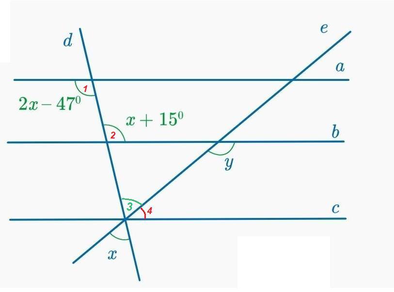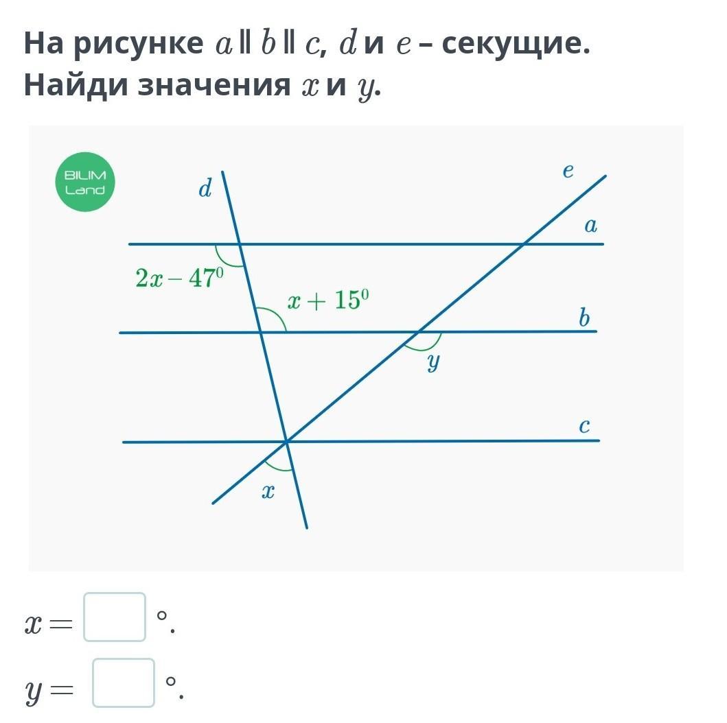 На рисунке a ∥ b ∥ c, d и e – секущие. Найди значения x и y.