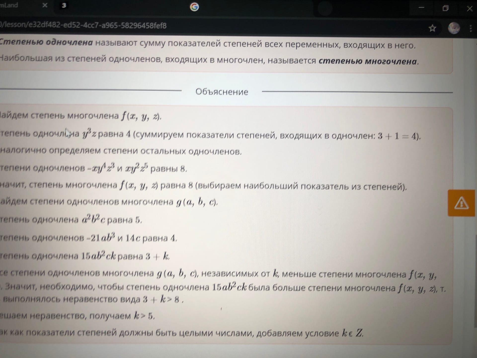 Определи значения k, при котором степень многочлена g (a, b, c) = a2b2c – 21ab3 + 15ab2ck + 14c4 будет больше степени многочлена f (x, y, z) = y3z – xy4z3 + xy2z5.