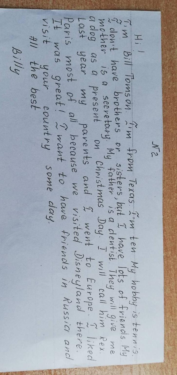 He wrote me that he's Bill Tomson. He's from Texas. He's ten. His hobby is tennis. He doesn't have brothers or sisters but he has lots of friends. His mother is a secretary. His father is a dentist. They will give him a dog as a present on Christmas Day. He will call him Rex. Last year his parents and him went to Europe. He liked Paris most of all because they visited Disneyland there. It was great! He wants to have friend in Russia and visit my country some day.
