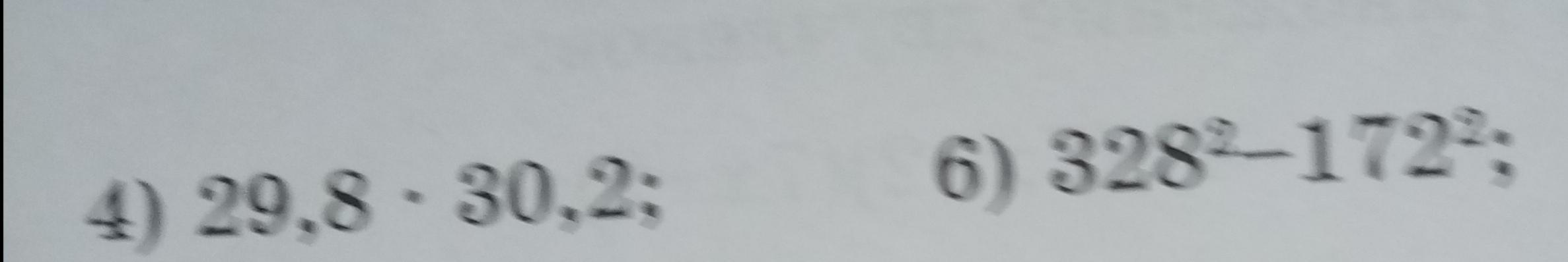 4) (30-0,2)*(30+0,2)=30^2 - 0,2^2=900 - 0,04=899,96; 6) 328^2 - 172^2= (328-172)(328+72)=156*400=62400.