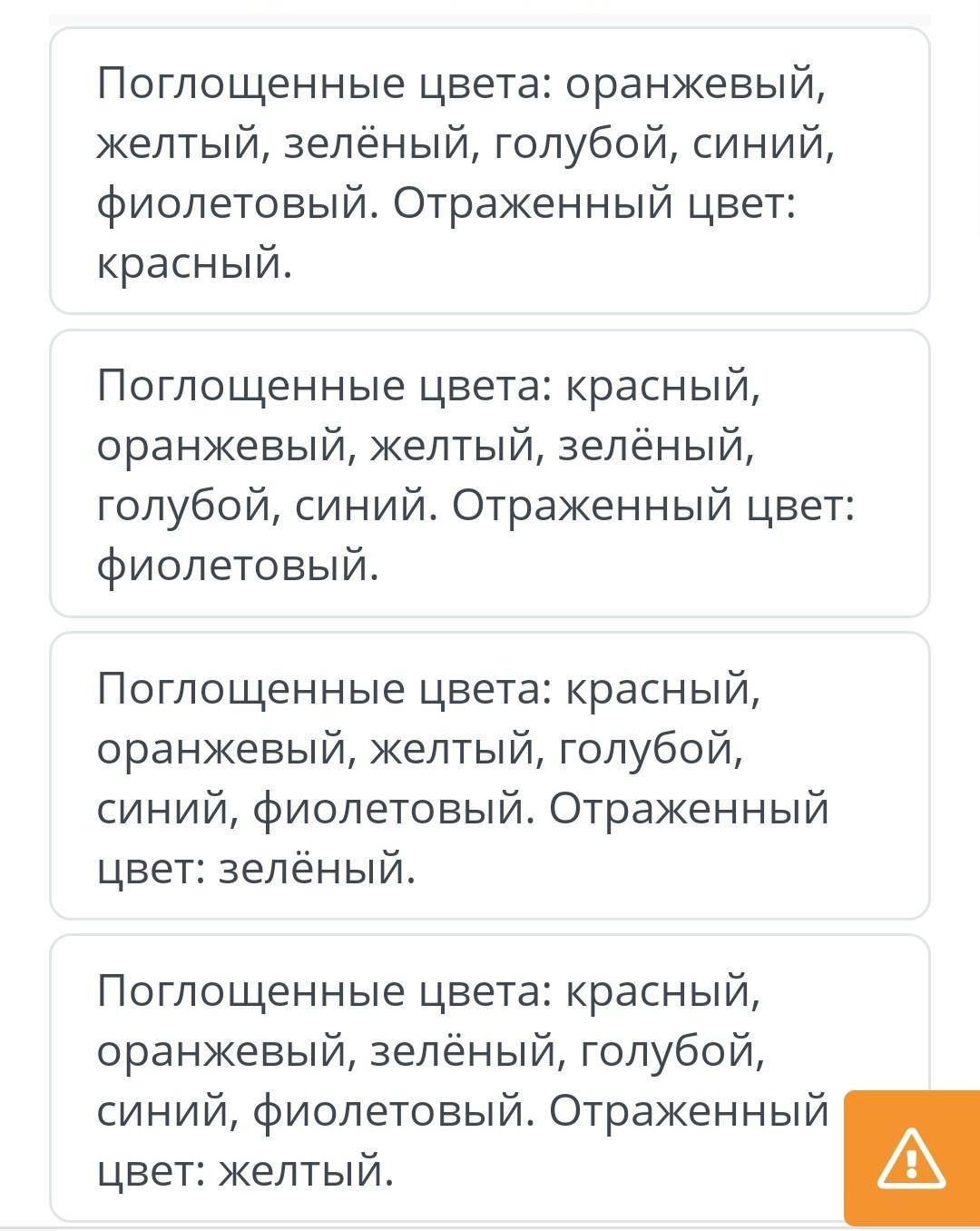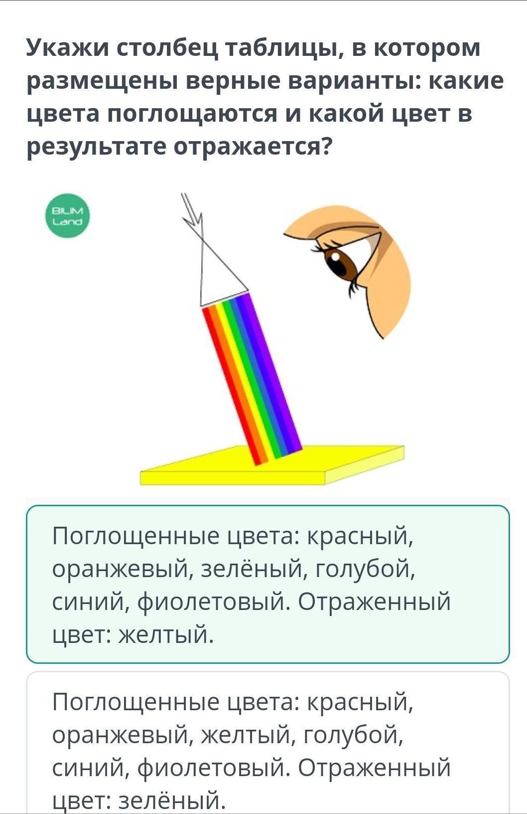 укажи столбец тоблицы , в котором размещены верные варианты : какие цвета поглощают и какой цвет в результате отражается ? ПОМОГИ ТЕ ПОЖАЛУЙСТА БЕЗ ОЩИБОК ПЖ