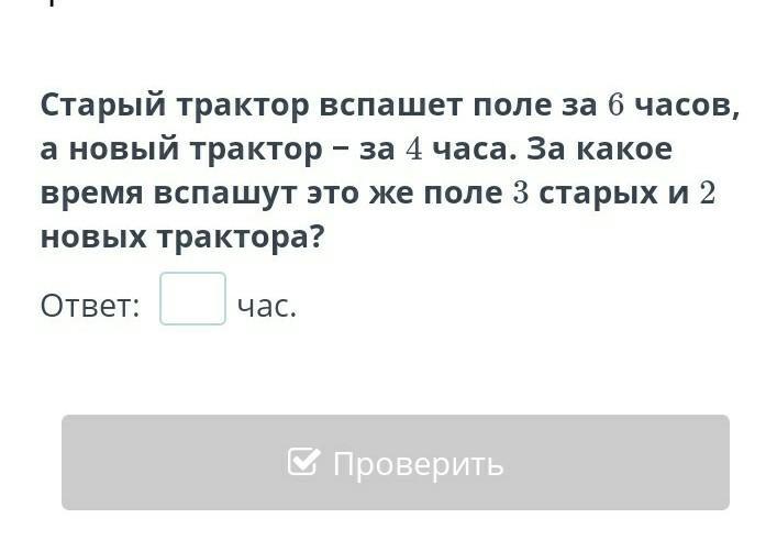 1) 6:3=2 часа. 2)4:2=2 часа. 3) 2:2 = 1 час. ответ: за 1 час в пашут 3 старых и 2 новых тракторы