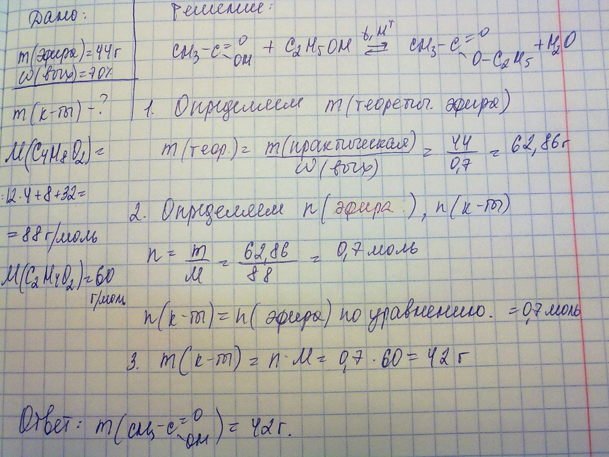 какую массу уксусной кислоты следует взять для получения 44 г этилацетата при выходе 70% от теоретически возможного.Ответ должен быть 43 г