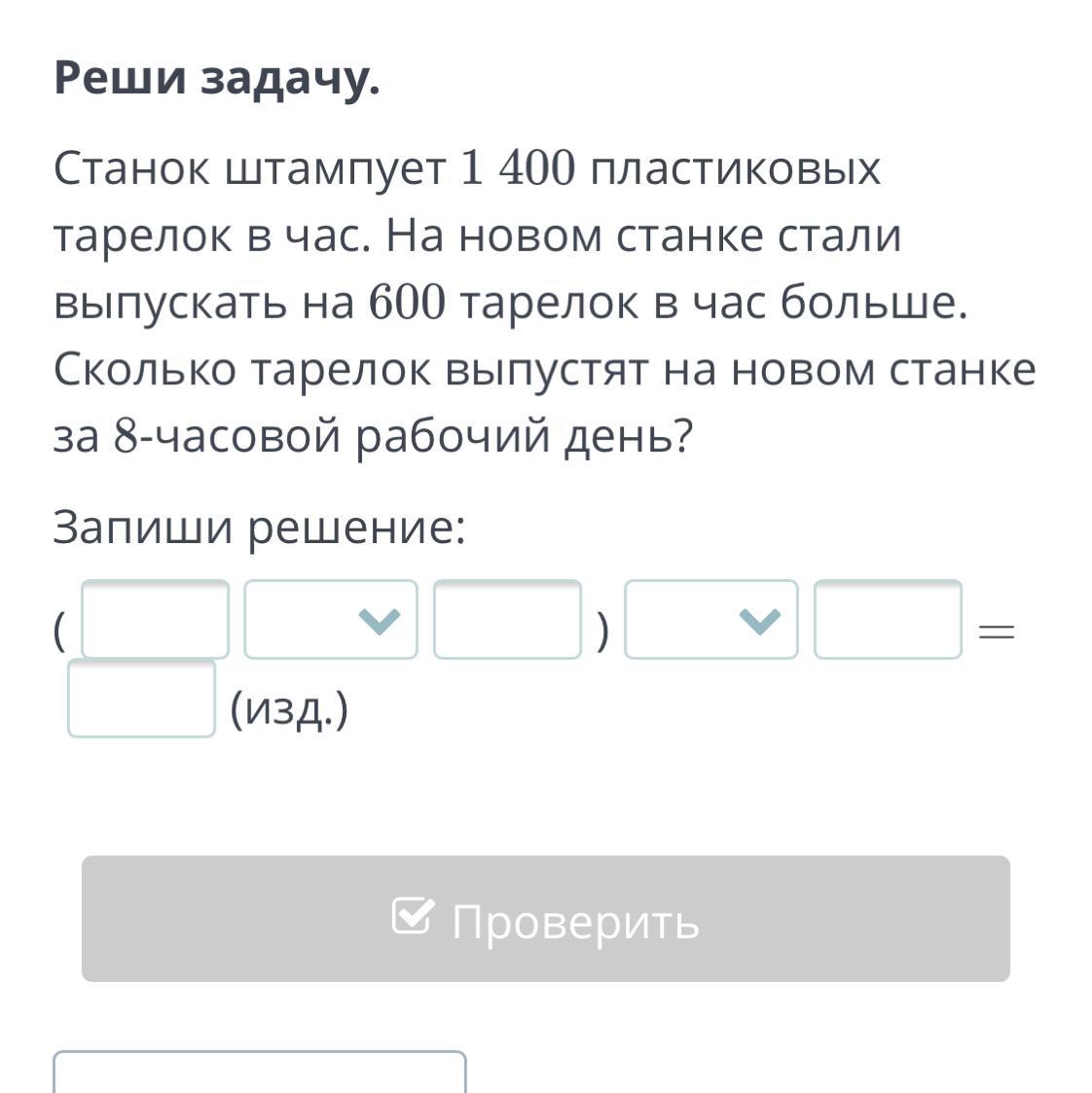 Станок штампует 1 400 пластиковых тарелок в час. На новом станке стали выпускать на 600 тарелок в час больше. Сколько тарелок выпустят на новом станке за 8-часовой рабочий день?