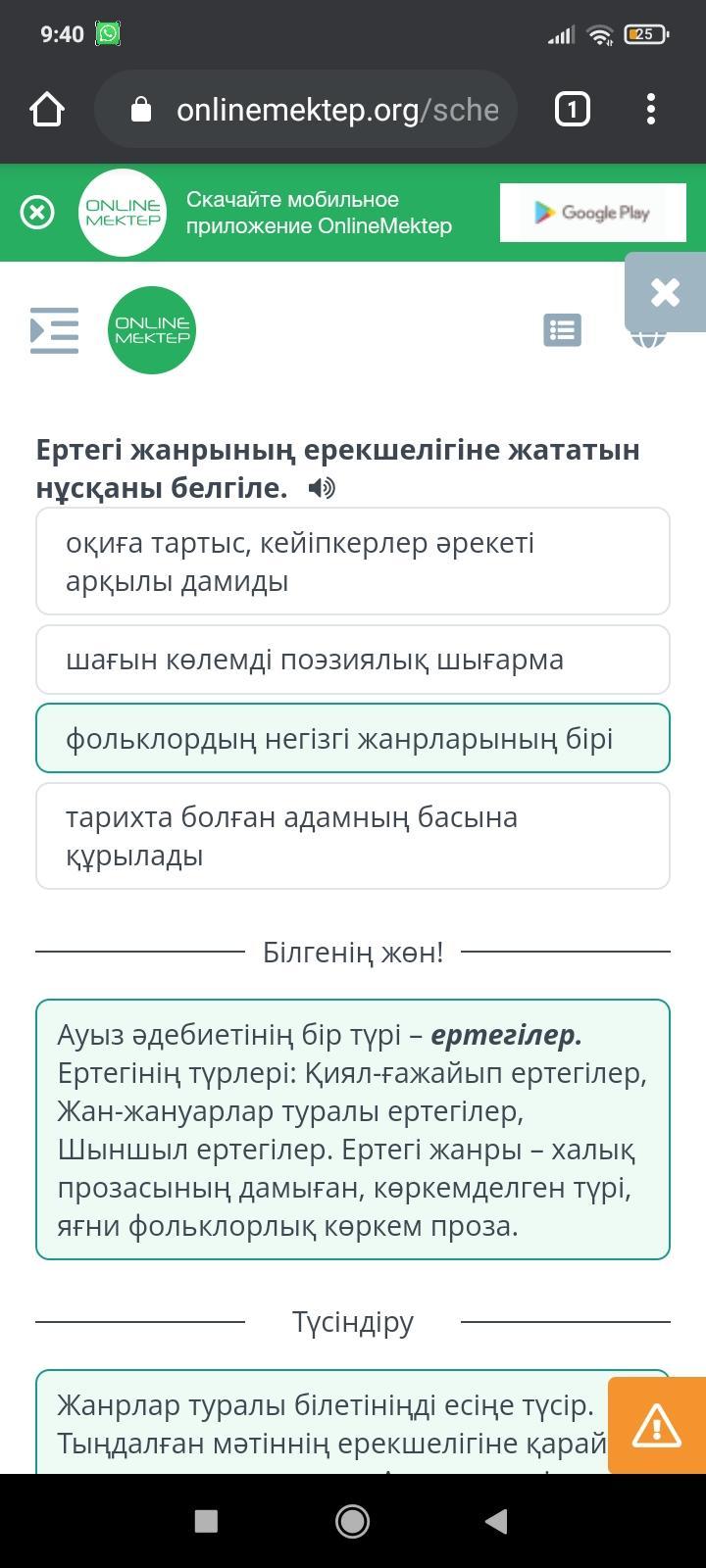 «Ең үлкен байлық» ертегісі. Ертегі жанрының ерекшелігіне жататын нұсқаны белгіле. Фольклордың негізгі жанрларының бірі. Шағын көлемді поэзиялық шығарма. Оқиға тартыс, кейіпкерлер әрекеті арқылы дамиды. Тарихта болған адамның басына құрылады