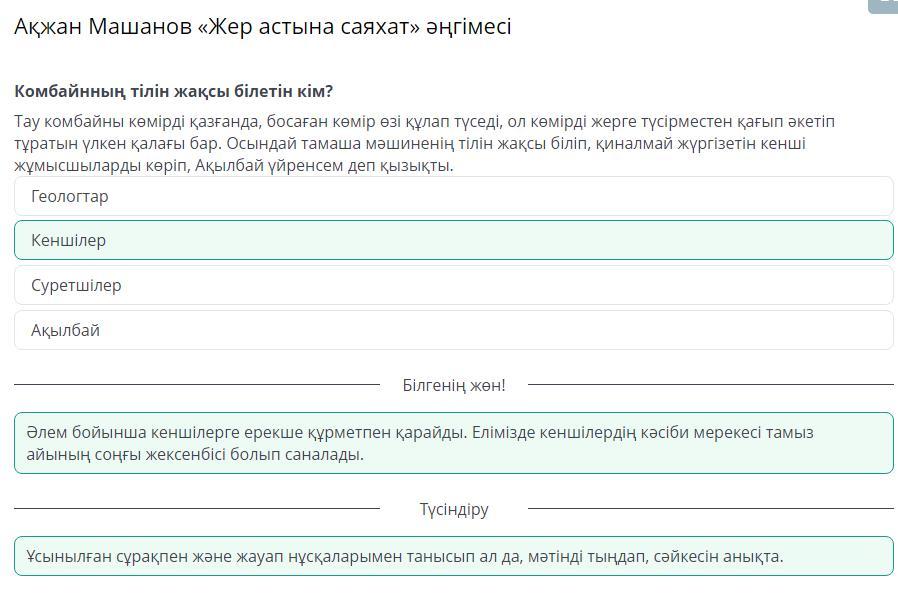 Ақжан Машанов «Жер астына саяхат» әңгімесі комбайнның тілін жақсы білетін кім Суретшілер Геологтар Кеншілер Ақылбай