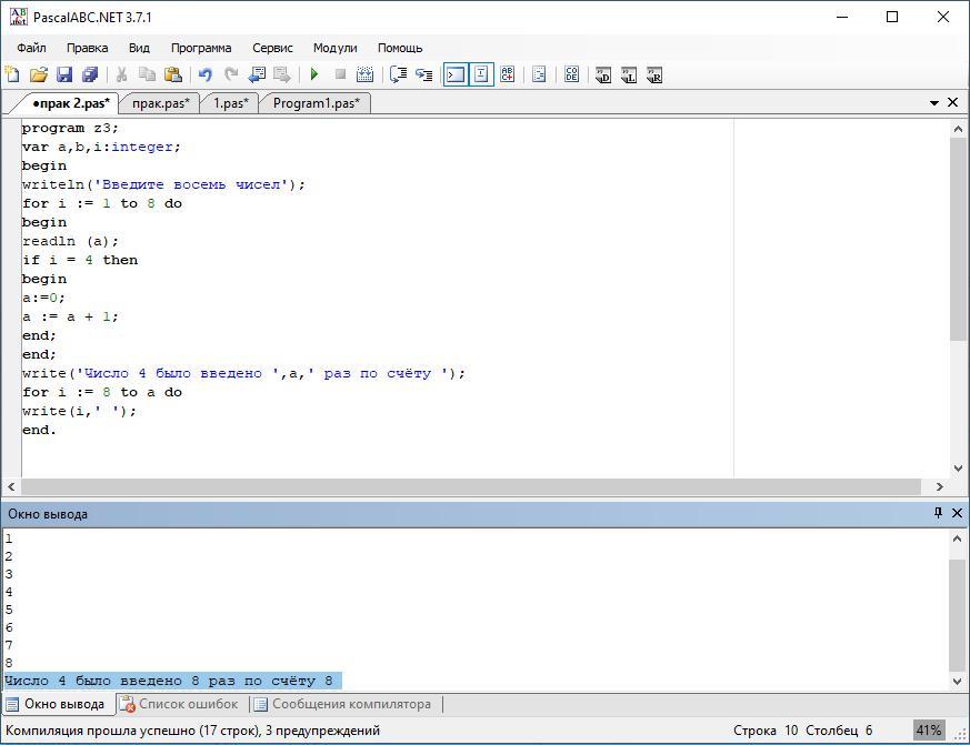 Помогите найти ошибку почему оно не считывает сколько раз было введено число 4. Создать и законспектировать в тетрадь программу: пользователь вводит 8 чисел, определите, сколько раз он ввел число 4.