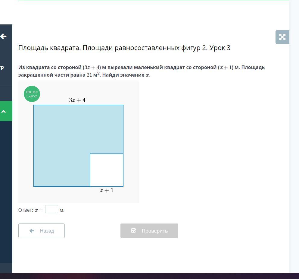Из квадрата со стороной (3x + 4) м вырезали маленький квадрат со стороной (x + 1) м. Площадь закрашенной части равна 21 м2. Найди значение x. Ответ: x = м.