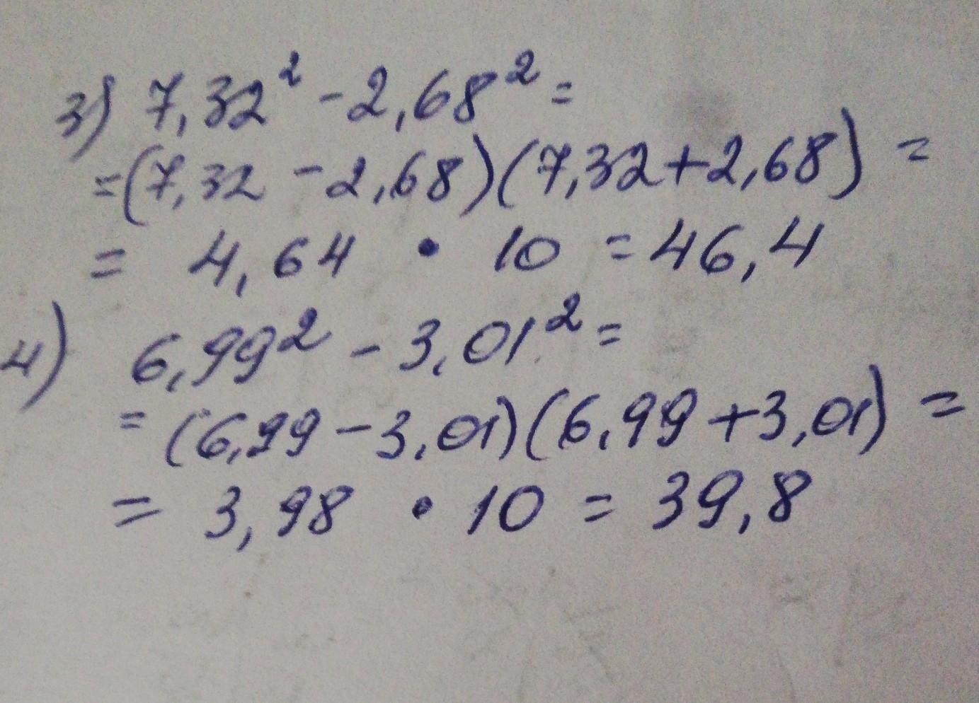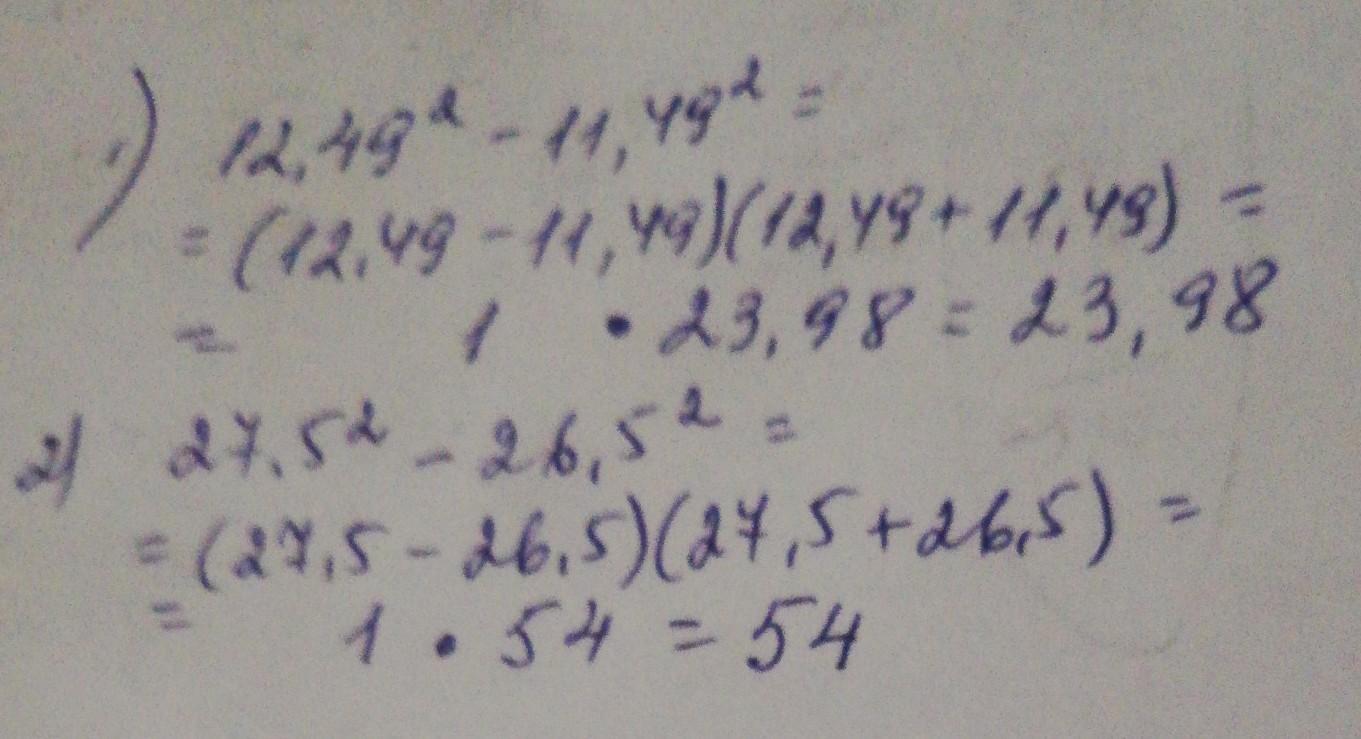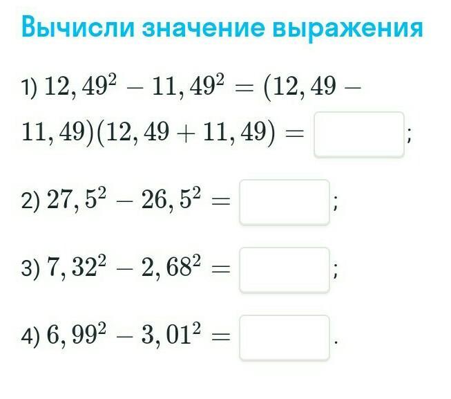 впервой скобке вычитаете, во второй скобке складываете, потом ответ, полученной в 1 скобке умножает на ответ во 2 скобке и все