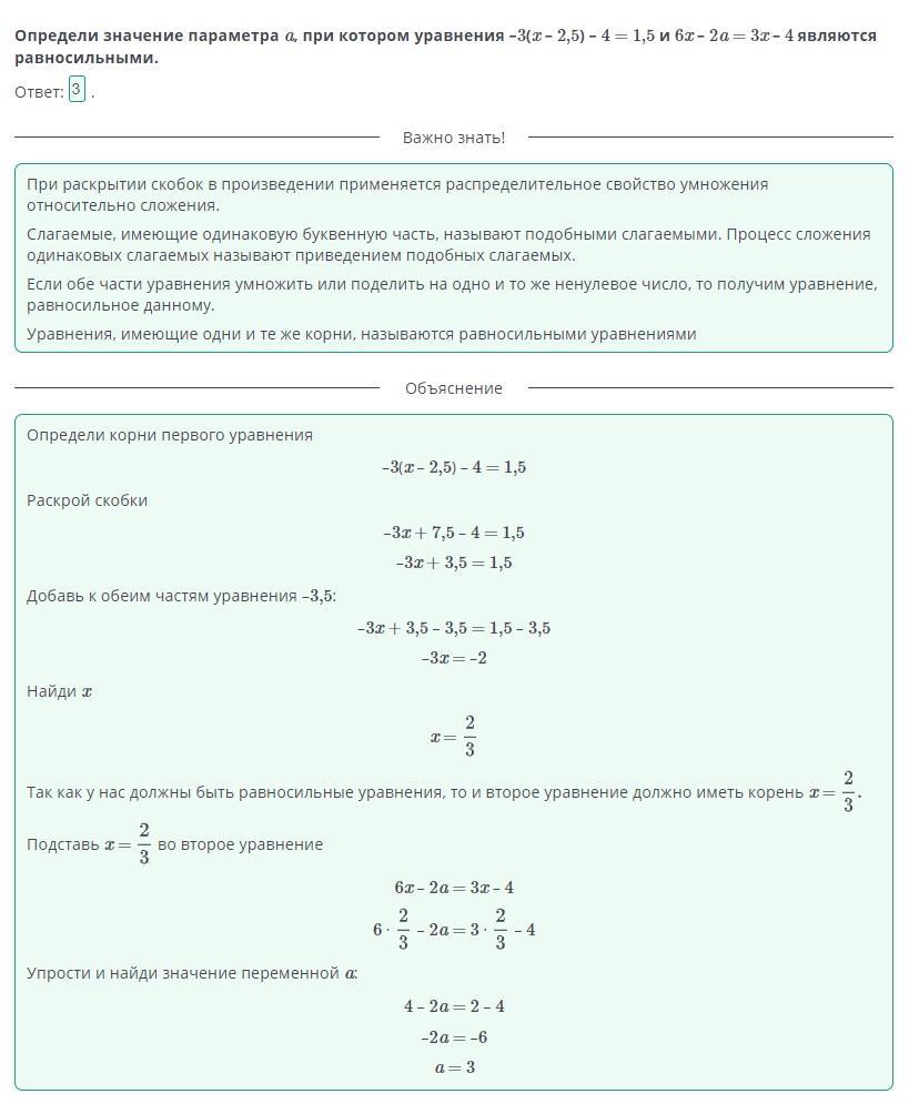 Определи значение параметра a, при котором уравнения –3(x – 2,5) – 4 = 1,5 и 6x – 2a = 3x – 4 являются равносильными. Ответ: .