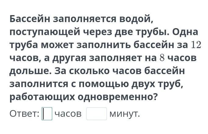 Бассейн заполнится двумя трубами за 15:2= 7,5 часов