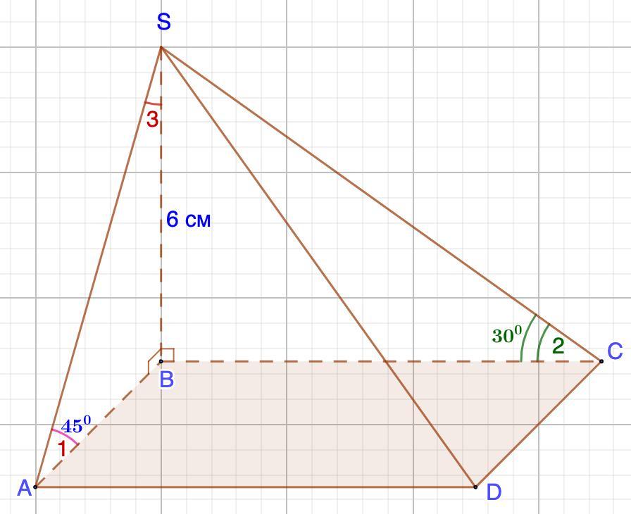 Основою піраміди є прямокутник . Висота піраміди проходить через одну з його вершин . Бічні грані , що не містять висотк , нахилені до площини основи під кутами 30° і 45°. Знайдіть об'єм піраміди , якщо її висота дорівнює 6 см
