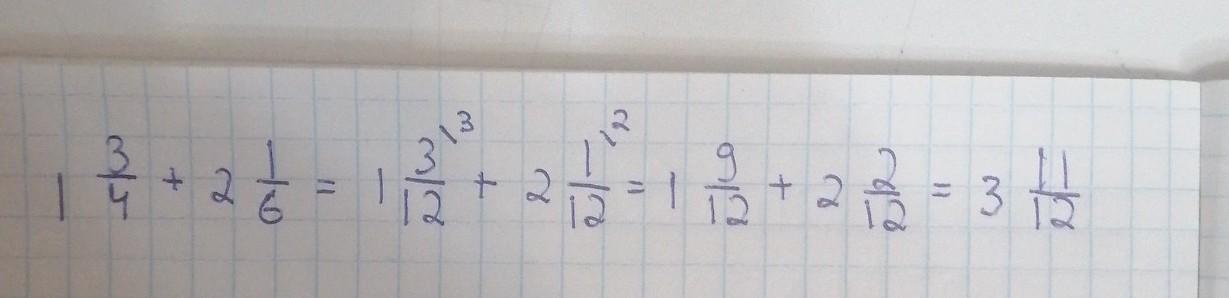 Для начала подберём общий знаменатель, это будет 12. Теперь 12 : 4 = 3, значит числитель у первой дроби умножается на 3, 12 : 6 = 2, значит числитель у второй дроби умножается на 2, следовательно получается: 1 9/12 + 2 2/12 = 3 11/12