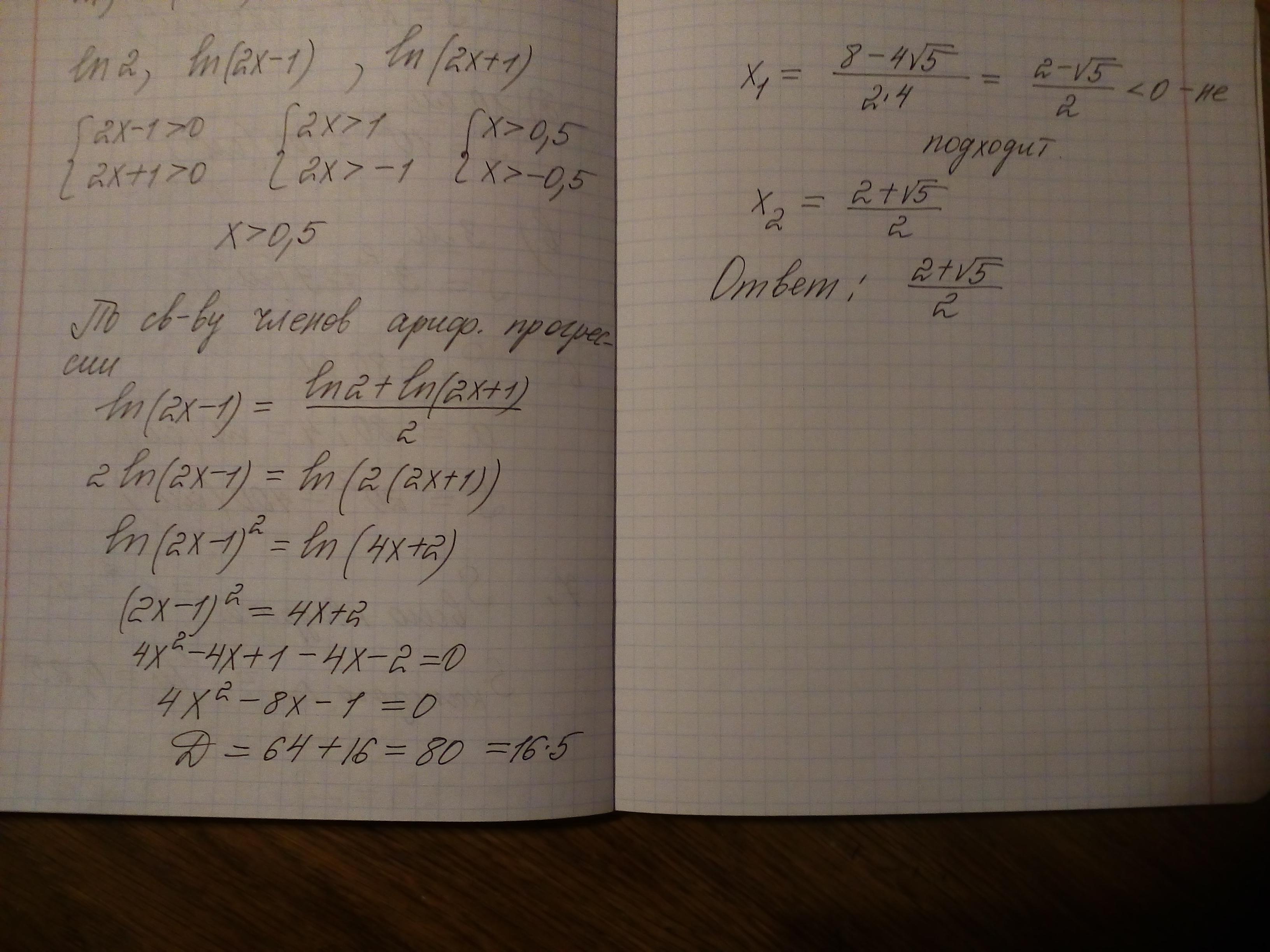 При каком значении х числа ln 2, In(2x – 1) и In(2x + 1) образуют арифмети-