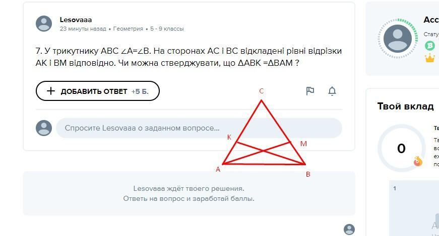 7. У трикутнику АВС ∠А=∠В. На сторонах АС і ВС відкладені рівні відрізки АК і ВМ відповідно. Чи можна стверджувати, що ∆АВК =∆ВАМ ?